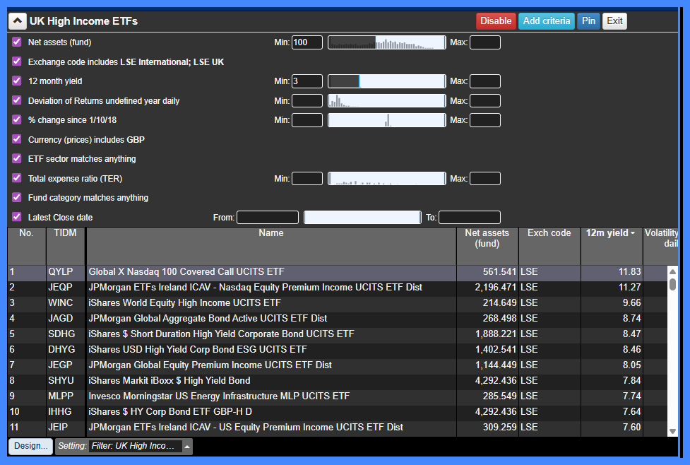 (You can run this screen for yourself by selecting the “PensionCraft – UK High Income ETFs” filter within ShareScope’s Filter Library.)