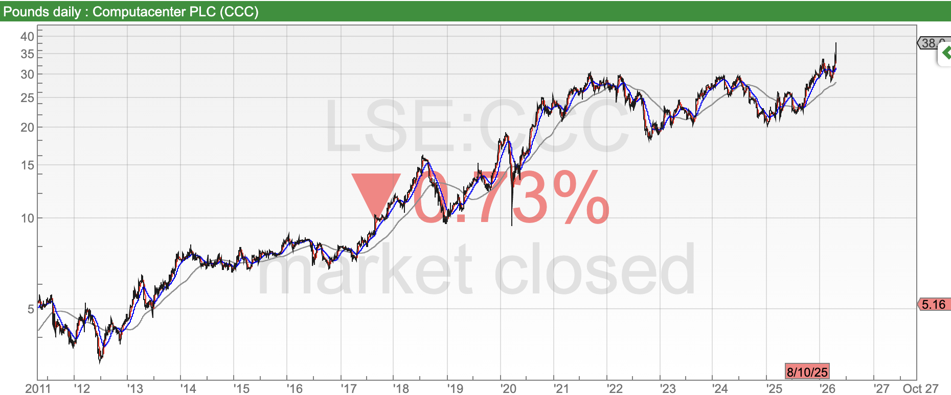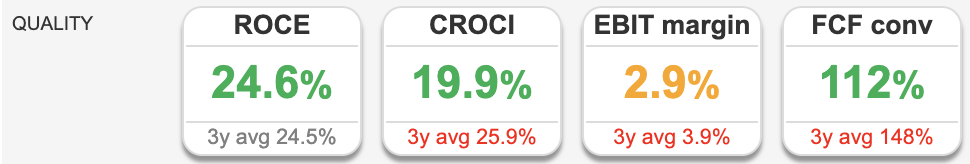 It’s understandable to conflate consistently low margin companies with poor performance. That would be a mistake though, sometimes groups can do very well with high volume, low margin strategies. CCC re-sells technology hardware, with some consultancy and project management. The long term chart (15 years, log scale) reveals that CCC has been a quality compounder, despite EBIT margins oscillating between 3% and 5%. The trend has continued as the share price enjoyed a strong start to 2026, +30% YTD.