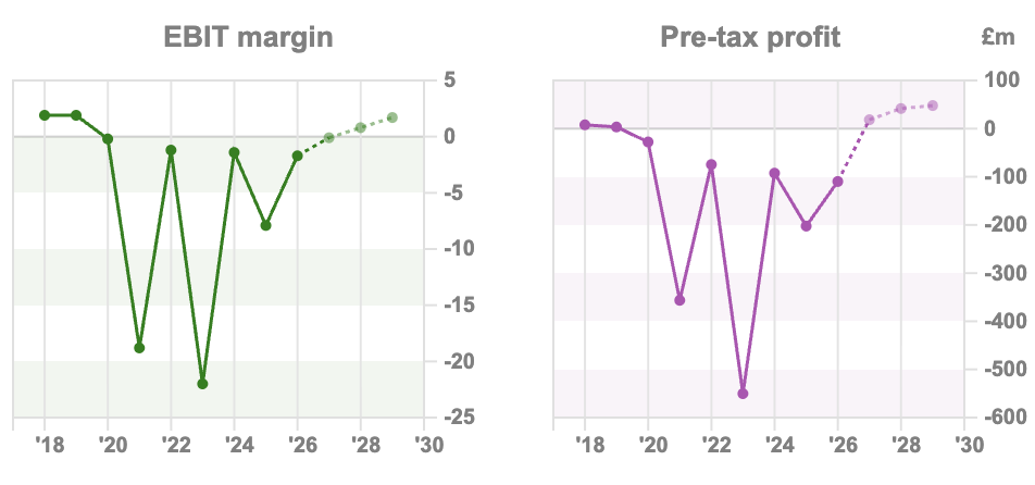 The Beauty division which is just under 60% of group revenue, and includes Lookfantastic, Dermstore and Jessica DeLuca’s Cult Beauty grew +6% on a continuing basis. Nutrition, led by the Myprotein brand, just over 40% of group revenue, grew +9%. Taking a longer term view, Sharescope reveals that revenue peaked at £2.2bn FY Dec 2022, and has declined by -23% to £1.7bn 3 years later. The group has never made a profit as a listed company, but is forecast to now grow the topline at mid single digits and (just about) break even FY Dec 2026F.
