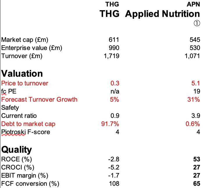 Valuation: ShareScope shows the group trading on 0.3 price/sales and 8x EV/EBITDA Dec 2026F. For comparison, APN trades on 4x price/sales and 13x EV/EBITDA Dec 2026F. I’ve used Sharescope’s “compare” feature, and downloaded the key data points into MS Excel. It strikes me that APN looks better on most profitability metrics, like RoCE and EBIT margin – and the valuation ratios are reflecting that. The question is whether the weak management team at THG can improve performance.